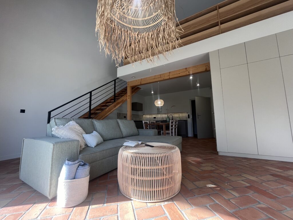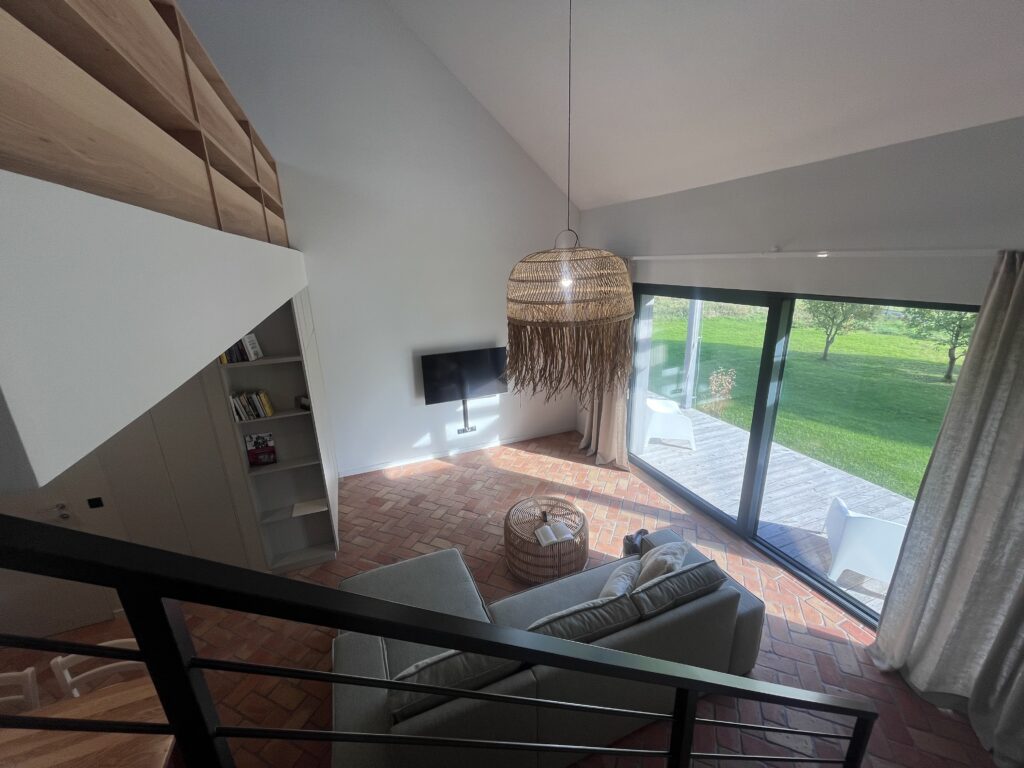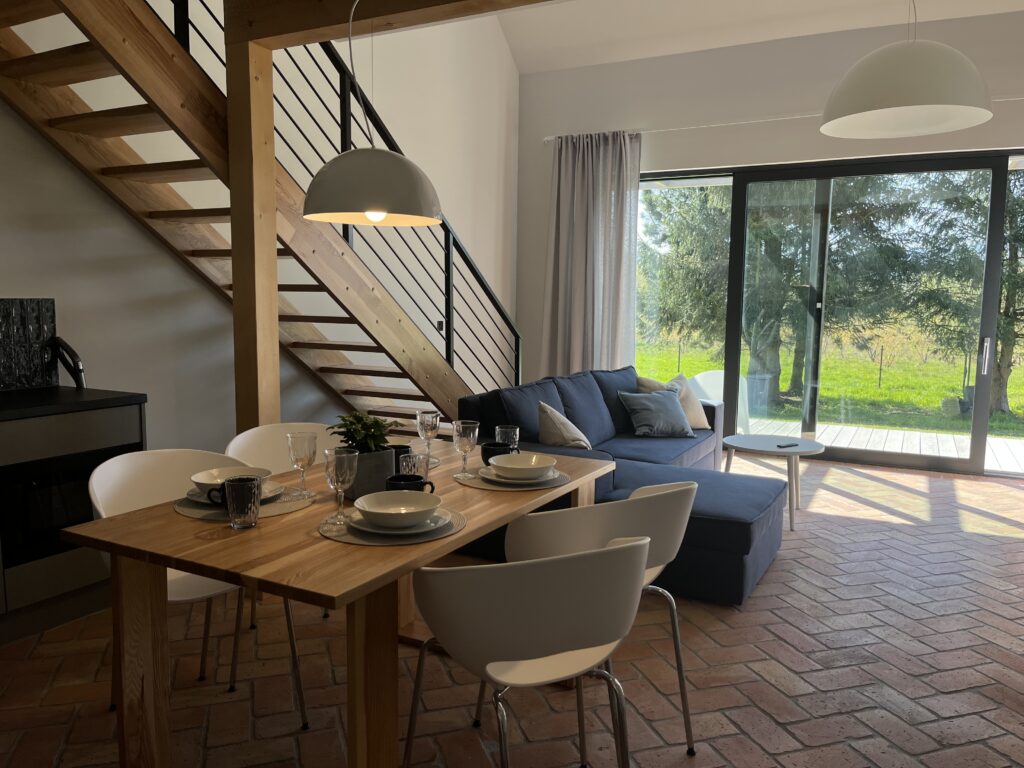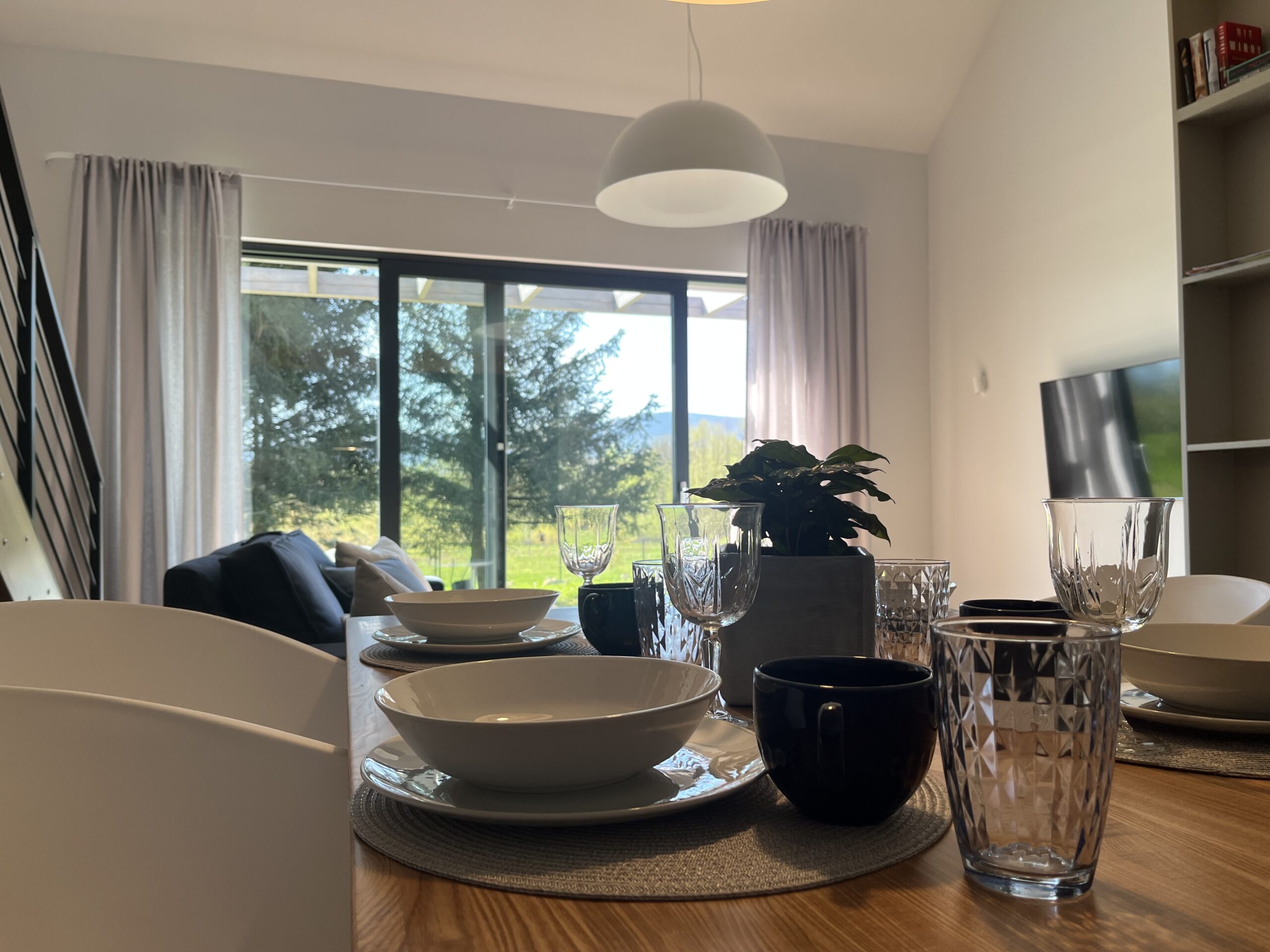 Na parter o powierzchni ok. 40m2 składa się przestronny salon, z wygodną, rozkładaną sofą i podręczną biblioteczką, w pełni wyposażony aneks kuchenny (ekspres ciśnieniowy, lodówka, płyta indukcyjna, zmywarka, mikrofalówka, komplet naczyń), jadalnia oraz łazienka z prysznicem (ręczniki i suszarka są na miejscu).