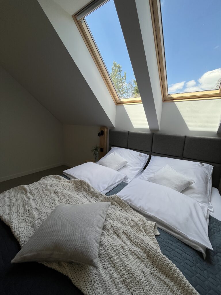 Na piętrze znajduję się otwarta antresola z wygodnym łóżkiem, z którego w pogodną noc można podziwiać rozgwieżdżone niebo.
